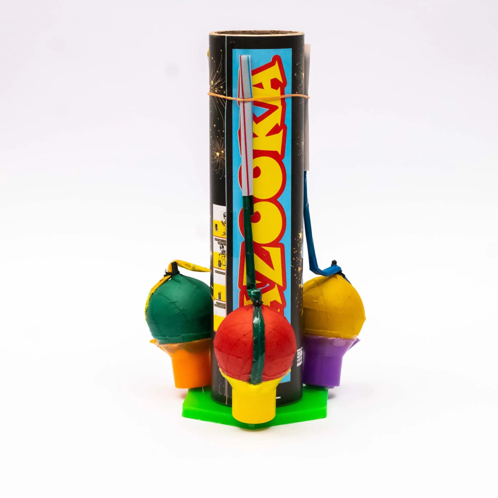 Instrucciones de Uso: Colocar una bazooka dentro del tubo sobre una base plana dejando la mecha por afuera, quitar un pedazo del forro de plástico de la mecha de aproximadamente 7 centímetros y encender, posteriormente retirarse 8 metros.